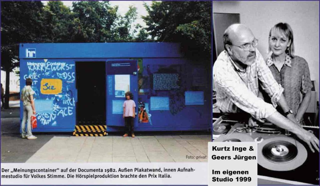 Der „Meinungscontainer“ war ein außergewöhnliches Projekt, das während der „documenta ’82“ in Kassel für 30 Tage in der Fußgängerzone aufgestellt wurde. Besucher konnten den Container betreten und dort hören, was andere vor ihnen in einer Sprechkabine gesagt hatten. Wer wollte, konnte selbst zum Mikrofon greifen und seine Gedanken, Meinungen, Schimpfereien, Anklagen, Appelle, Gedichte oder Lieder verewigen.