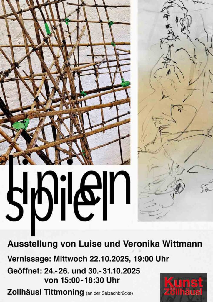 Die Galerie im Zollhäusl an der Salzachbrücke in Tittmoning besteht seit zehn Jahren. Mit durchschnittlich drei Kunst-Ausstellungen im Jahr und den unterhaltsamen Vernissagen auf engstem Raum ist es ein beliebter Treffpunkt geworden, zu dem anspruchsvolle Kunstkenner ebenso gerne kommen wie interessierte Leute, die das Rahmenprogramm und die Gespräche mit Gleichgesinnten schätzen. Die Herbst-Ausstellung in diesem Jahr widmet die Galeristin der Künstlerin Luise Wittmann (also sich selbst) und ihrer Tochter, Veronika Wittmann. Die zwei völlig unterschiedlichen Präsentationen tragen gemeinsam den Namen „Linien-Spiel“.